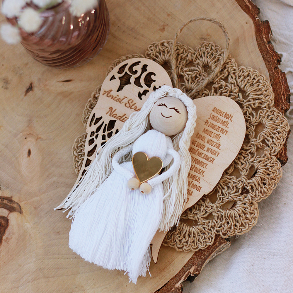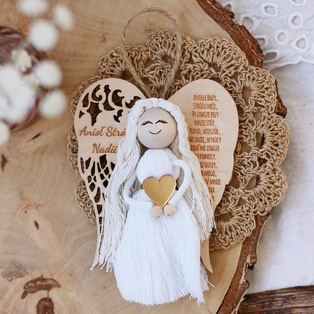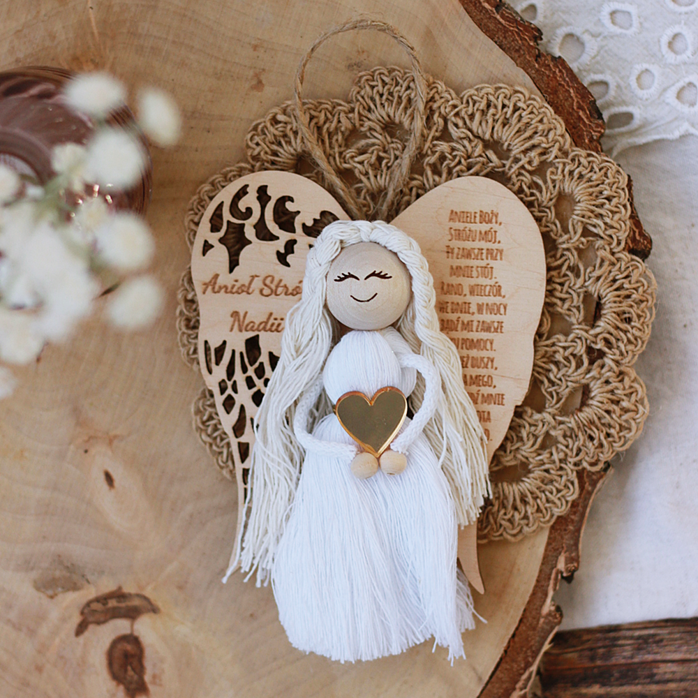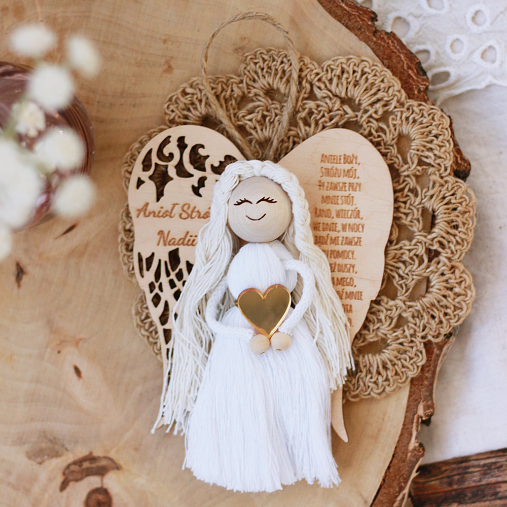 Anioł personalizowany makrama pamiątka, grawer, serce lustro - prezent I Komunia Święta/Chrzest Święty