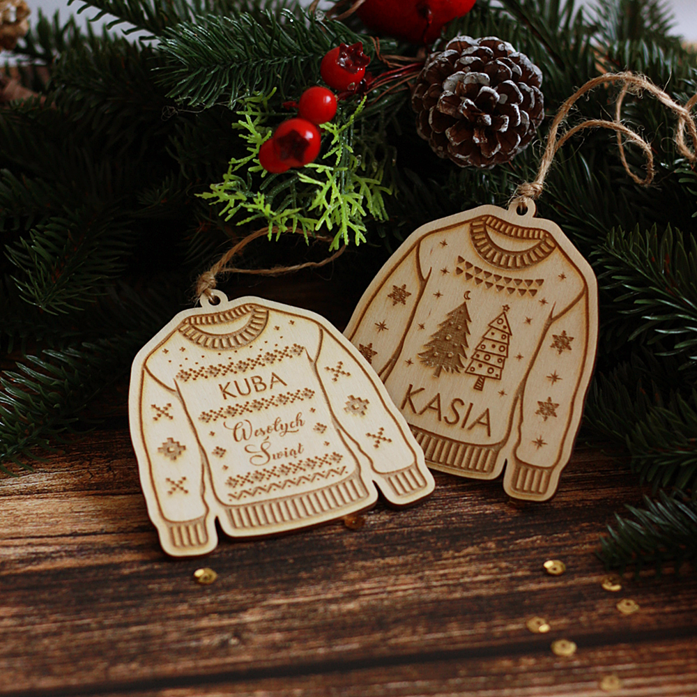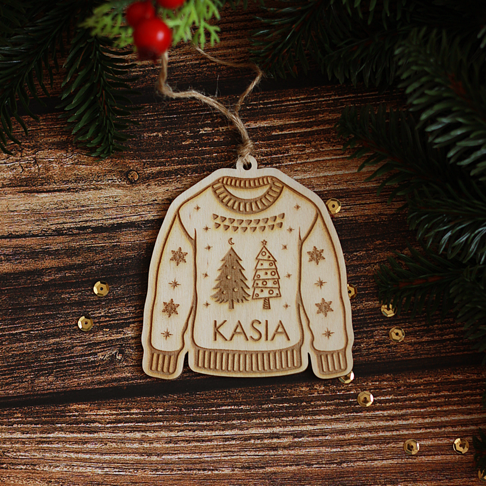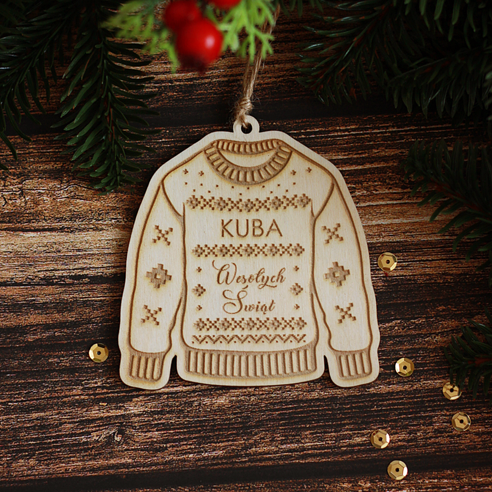 Bombka świąteczna, sweter, sweterek świąteczny, zawieszka, sklejka, personalizacja - Mikołajki/ Święta Bożego Narodzenia
