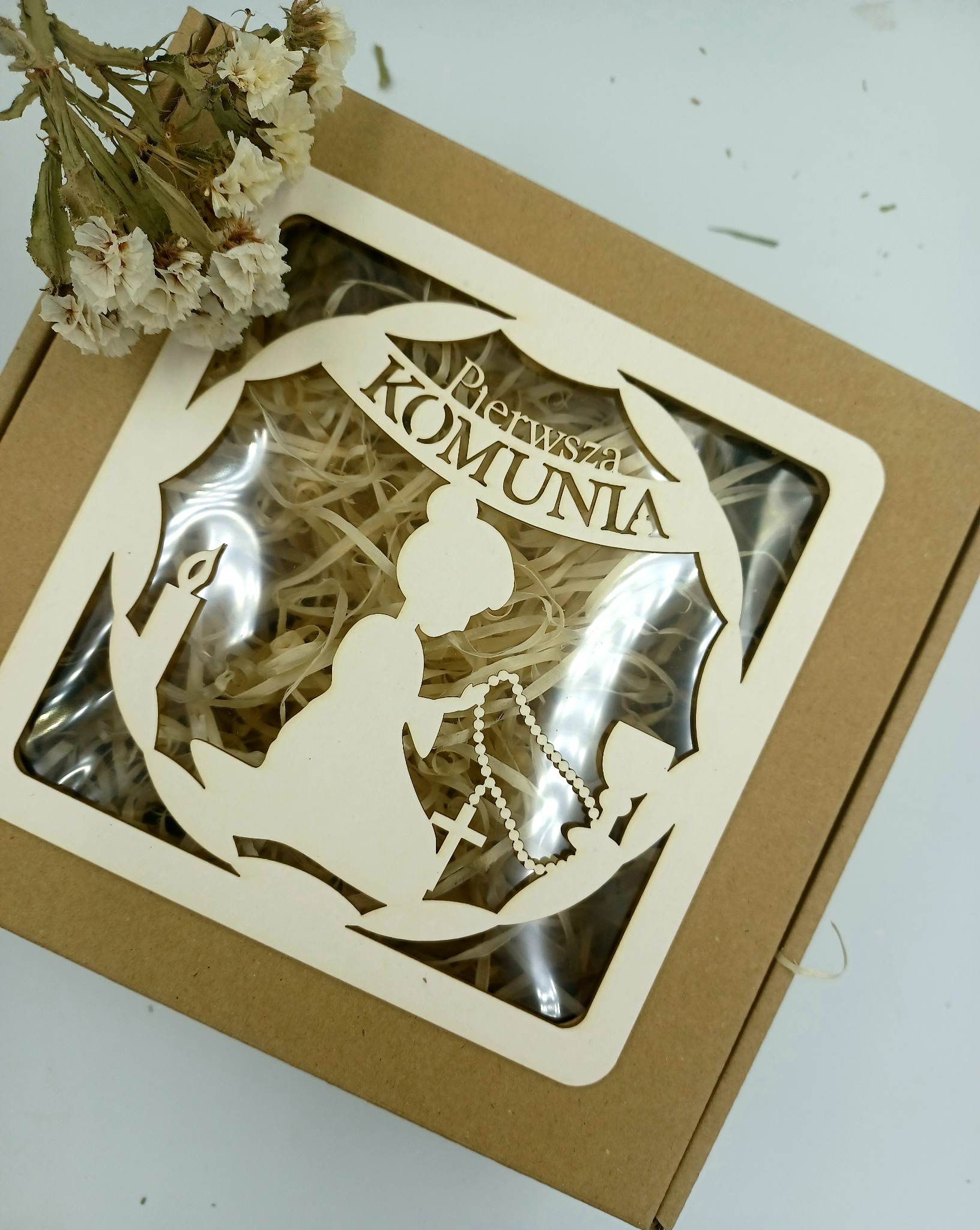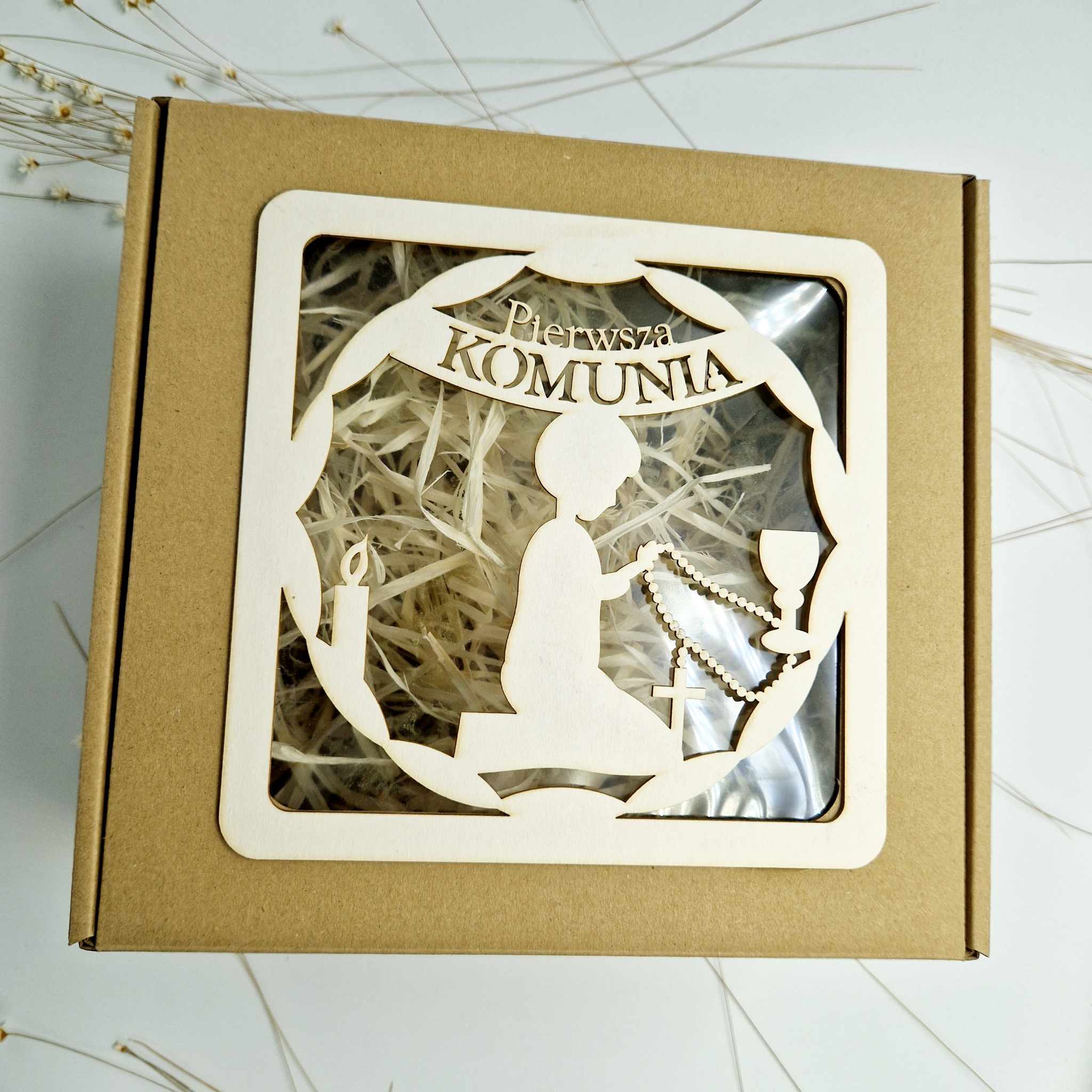 Elegancki, personalizowany box podarunkowy, idealny na I Komunię Świętą. Wypełniony siankiem, z unikalną grafiką na birmacie. Doskonały wybór na wyjątkowy prezent.