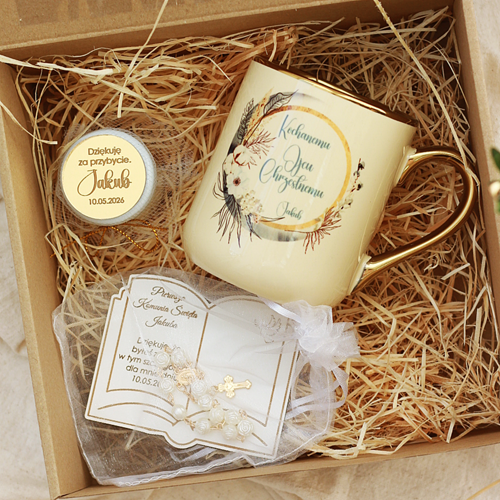 Box prezentowy I Komunia Święta - podziękowanie dla Matki Chrzestnej, Ojca Chrzestnego, Chrzestnych: personalizowana książka magnes, kubek z nadrukiem, mini świeczka sojowa.