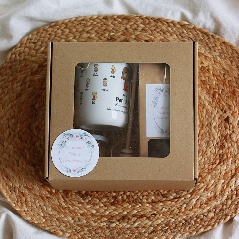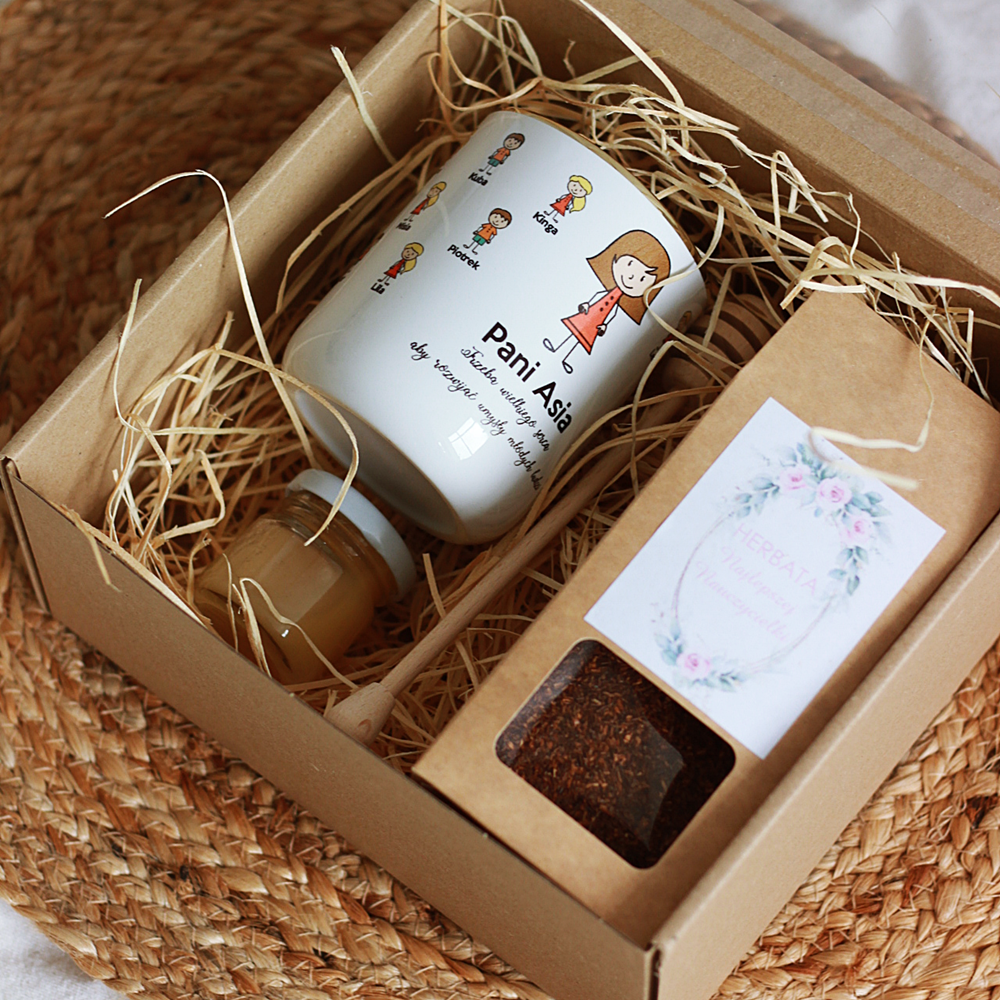 Box prezentowy/ zestaw kubek z klasą, miód, łyżka do miodu, herbata - wyjątkowy prezent Dla Nauczyciela/ Zakończenie roku szkolnego