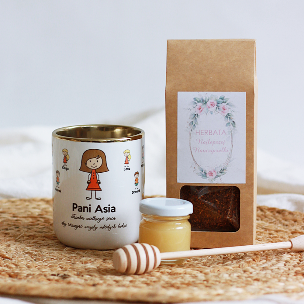 Wyjątkowy zestaw prezentowy dla nauczyciela to eleganckie połączenie personalizowanego kubka, naturalnego miodu i aromatycznej herbaty. Idealny na zakończenie roku szkolnego lub Dzień Nauczyciela.