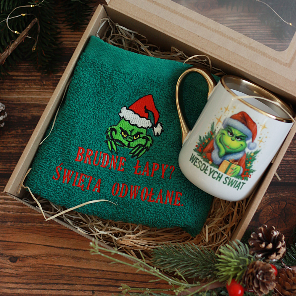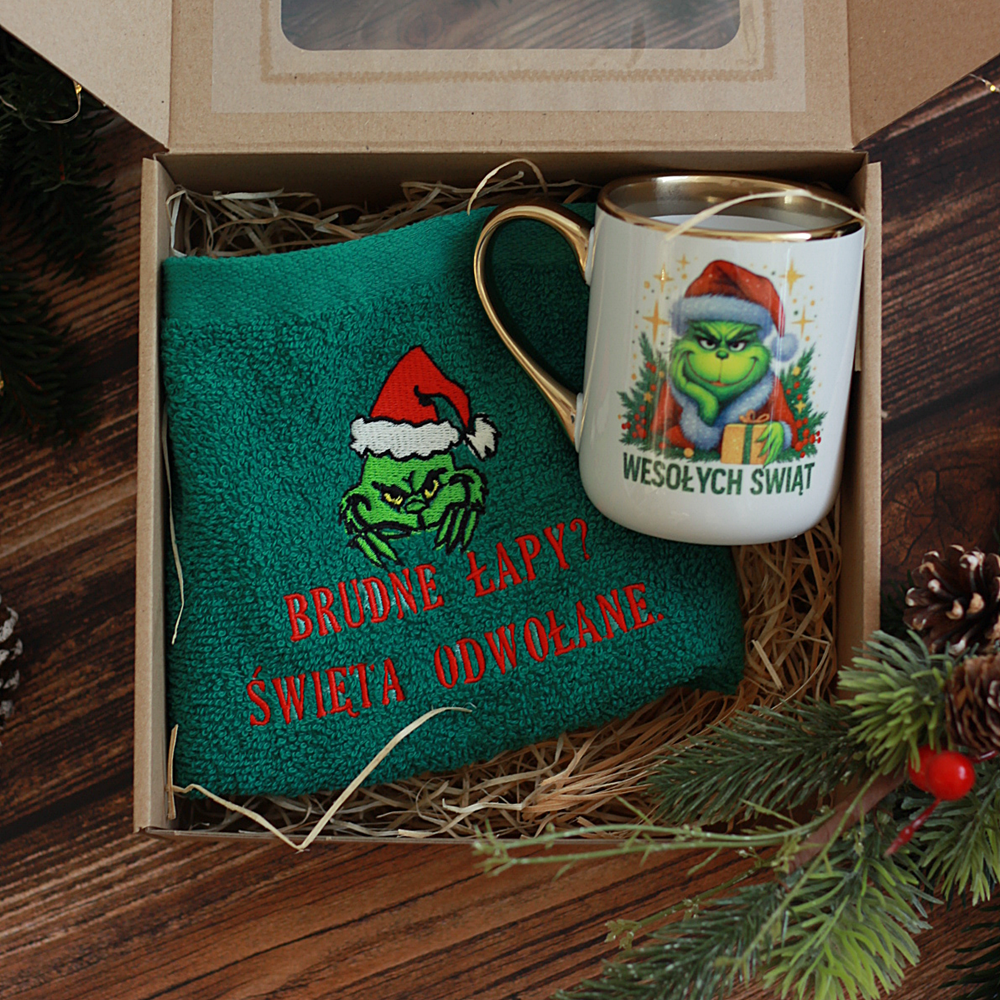 Box prezentowy/ zestaw świąteczny ręcznik haftowany, kubek z nadrukiem, zestaw Grinch - prezent Mikołajki/ Święta Bożego Narodzenia