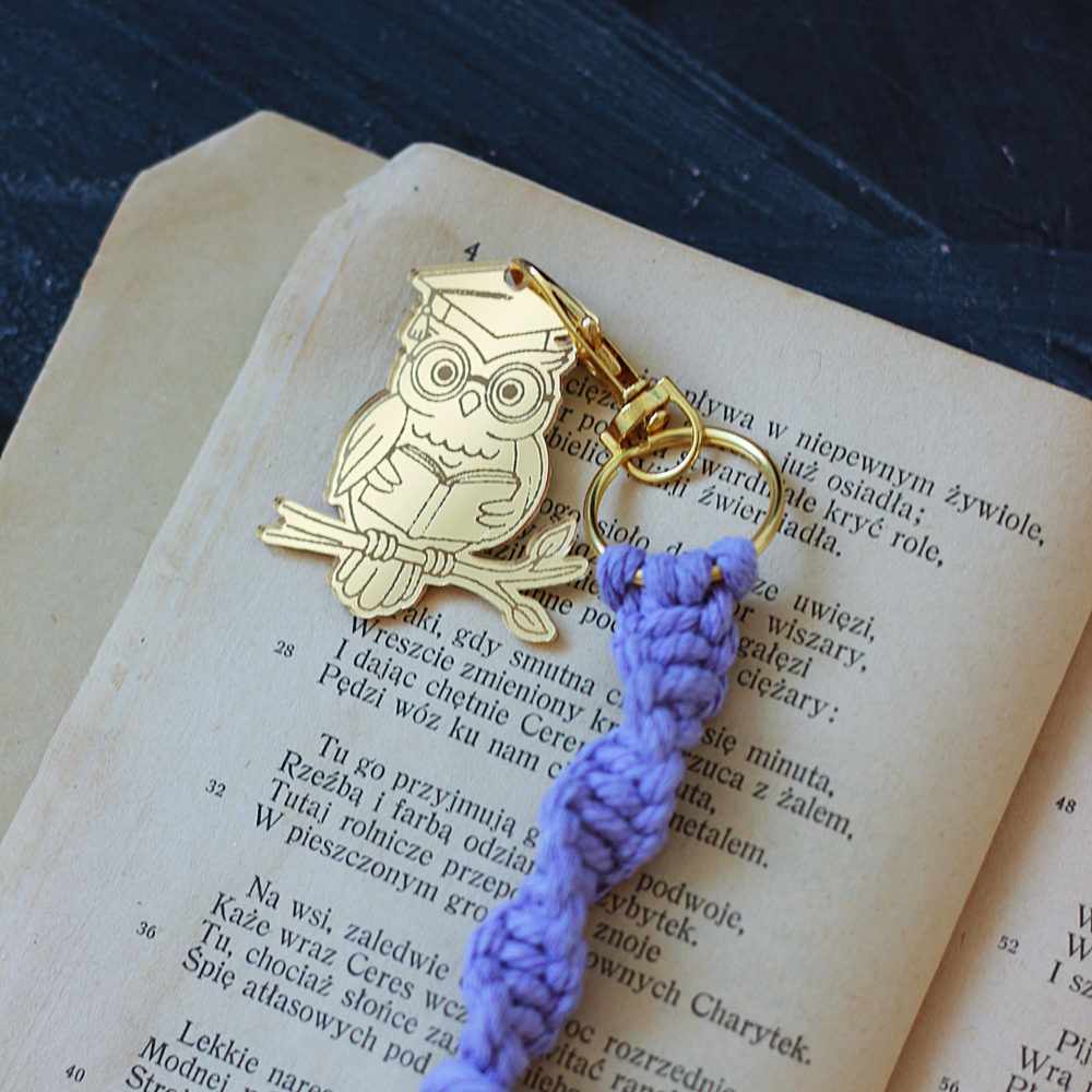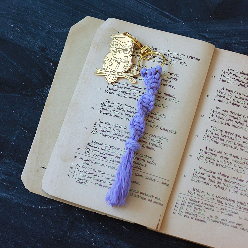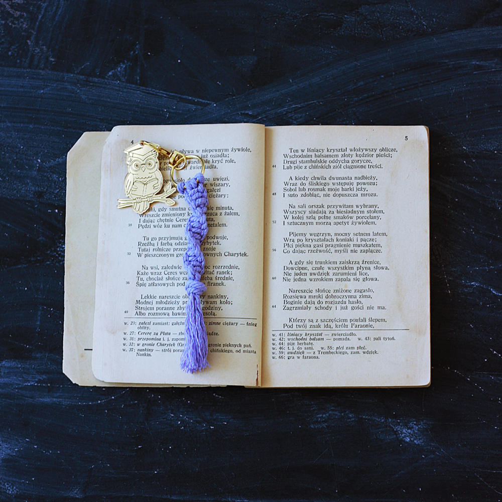 Uroczy brelok w kształcie sowy wykonany z makramy i lustrzanego akcentu to wyjątkowy upominek dla nauczyciela. Symbol mądrości w eleganckiej i modnej formie.
