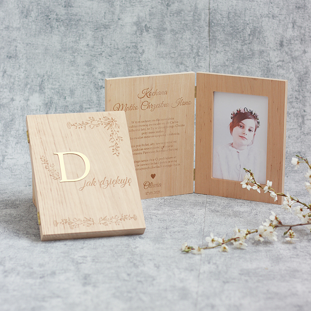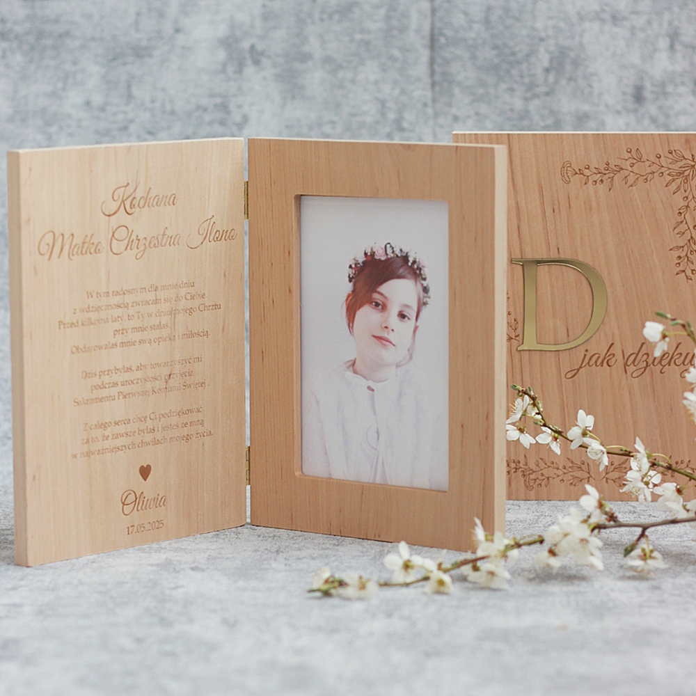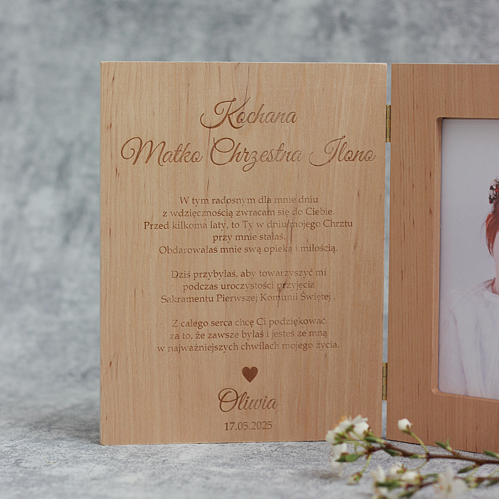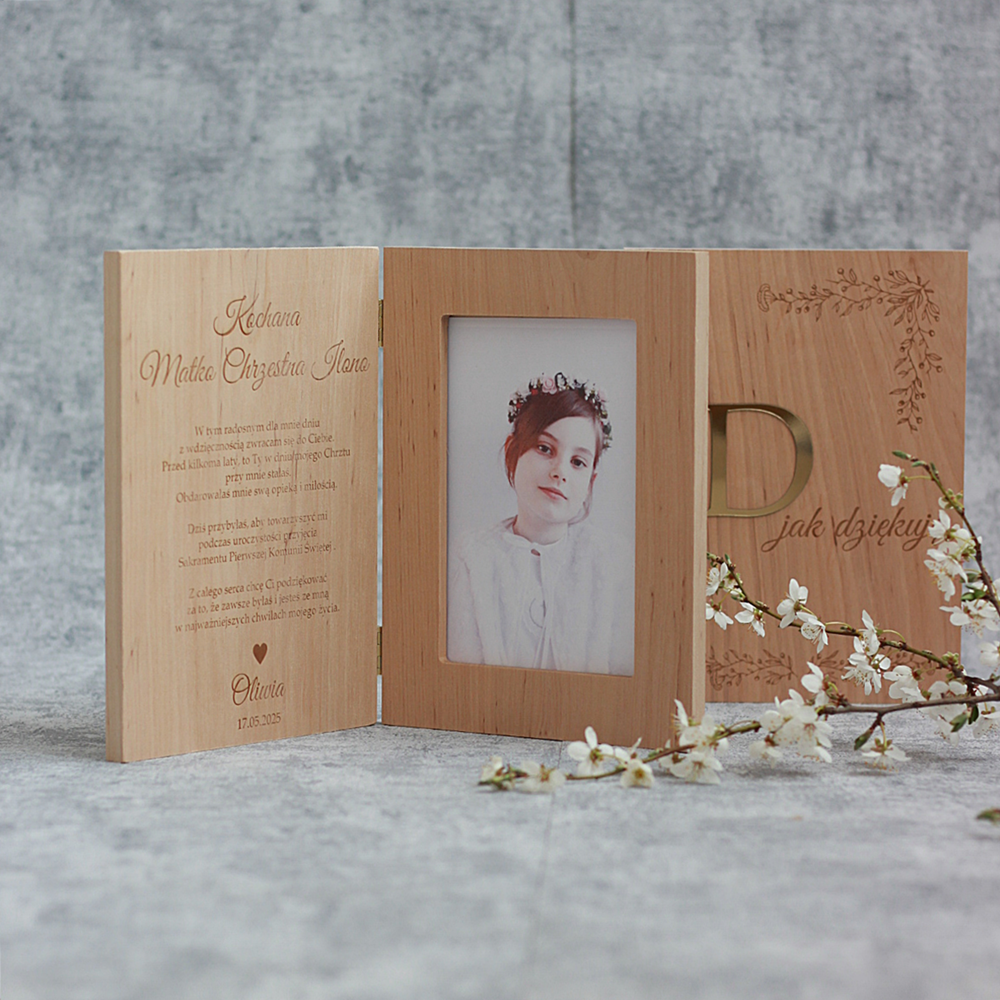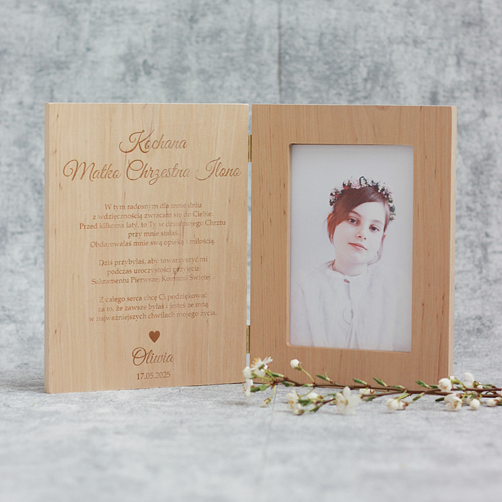 Drewniana ramka ze zdjęciem podziękowanie I Komunia Święta - rodzice, chrzestni, dziadkowie, goście