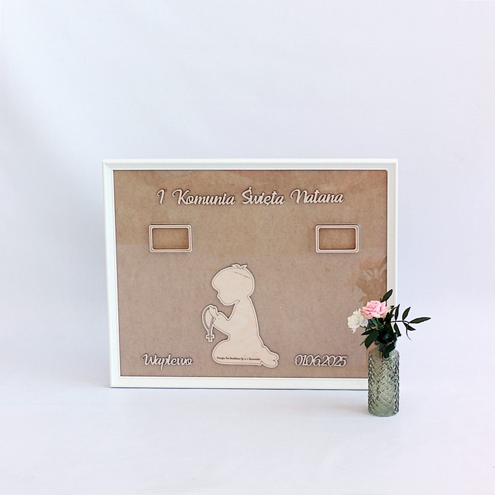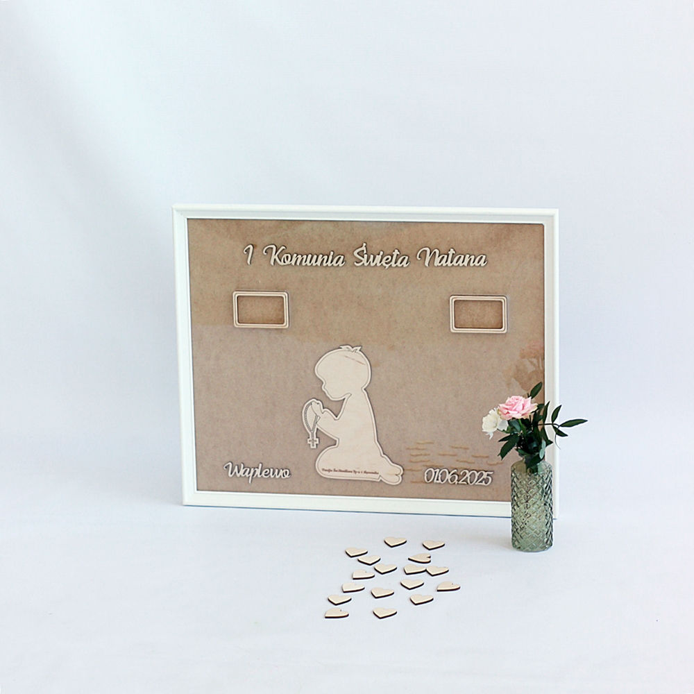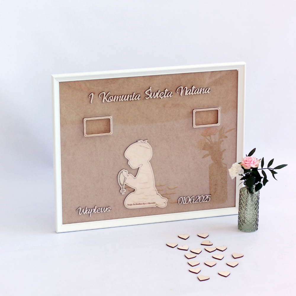 Rama w formie księgi gości to wyjątkowa pamiątka na I Komunię Świętą. Wymiary ramy to 50 cm na 40 cm, a na serduszkach goście mogą się podpisać i wrzucić je do środka, tworząc niezapomnianą pamiątkę z tego ważnego dnia. Rama jest w pełni personalizowana, dzięki czemu staje się wyjątkowa i dostosowana do Twoich potrzeb.