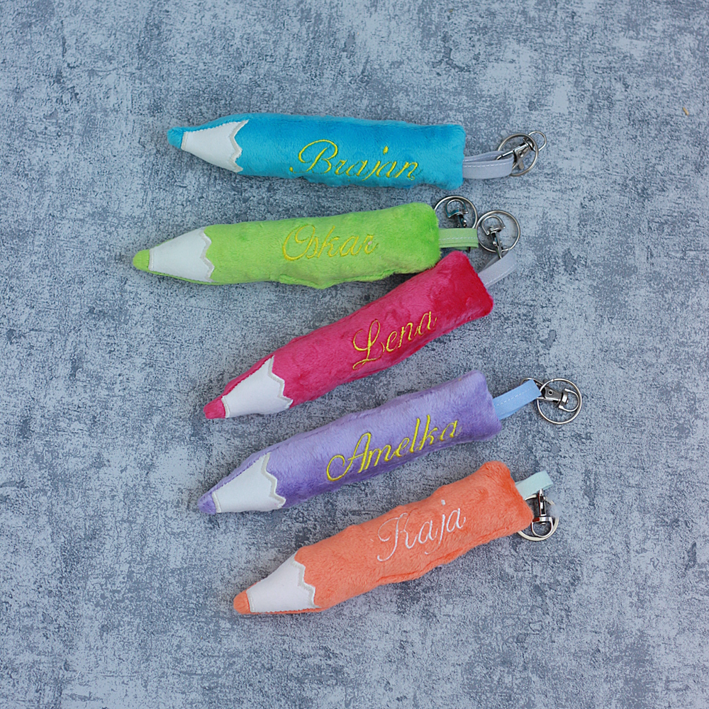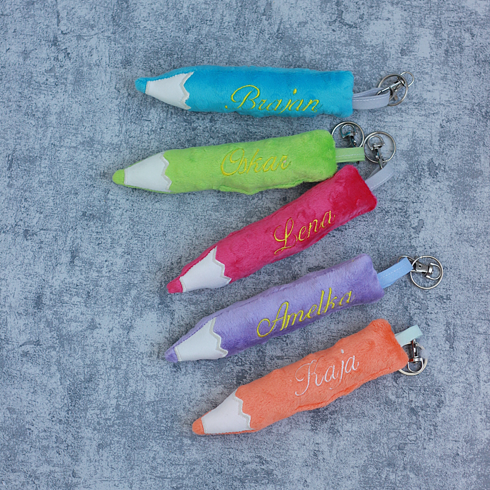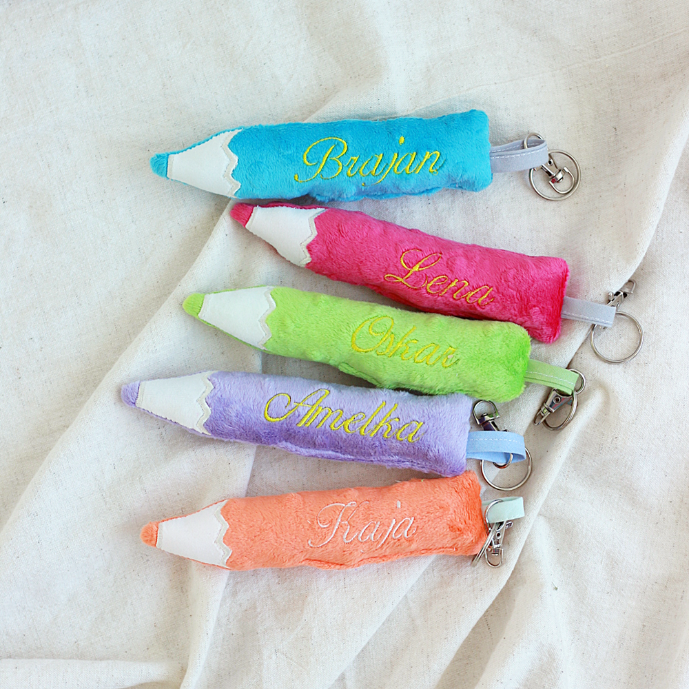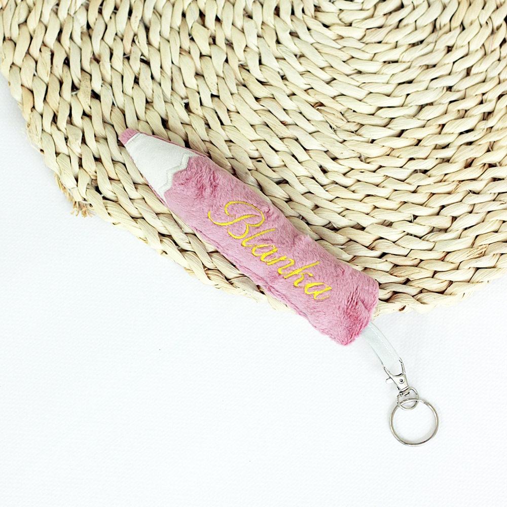 Uroczy brelok w kształcie kredki z wyhaftowanym imieniem to wyjątkowy i personalizowany dodatek. Wykonany z miękkiej tkaniny minky, zachwyca kolorami i starannym wykonaniem.