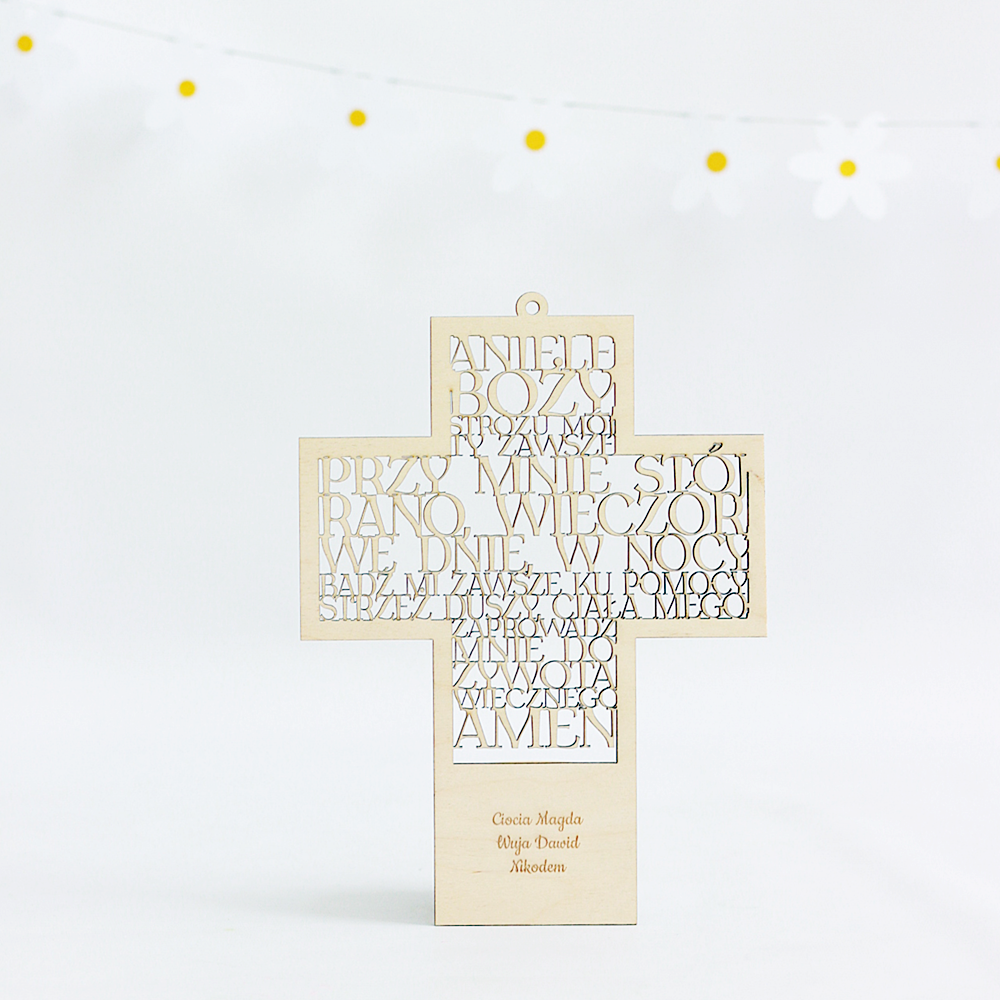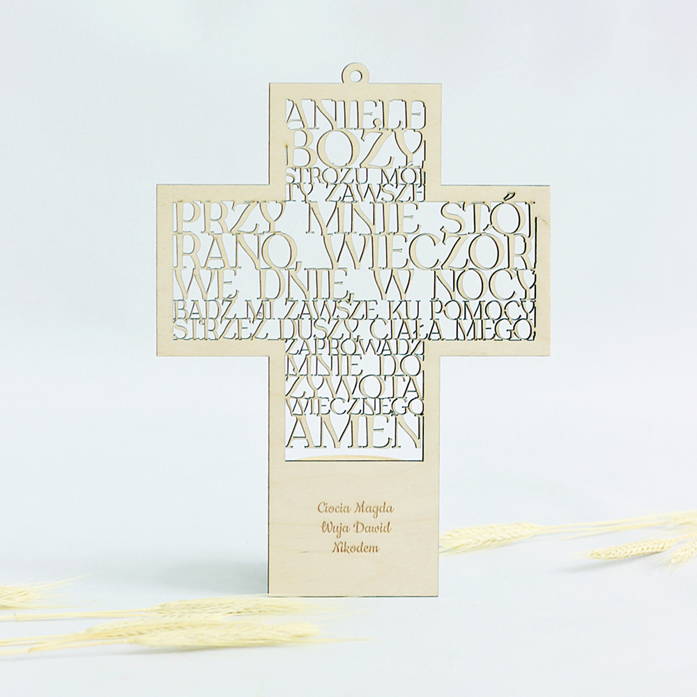 Elegancki krzyż z modlitwą, idealny na I Komunię Świętą, Chrzest lub inne szczególne okazje. Wykonany z wysokiej jakości sklejki, z możliwością personalizacji poprzez grawerowanie imienia lub daty. Doskonała pamiątka na lata.