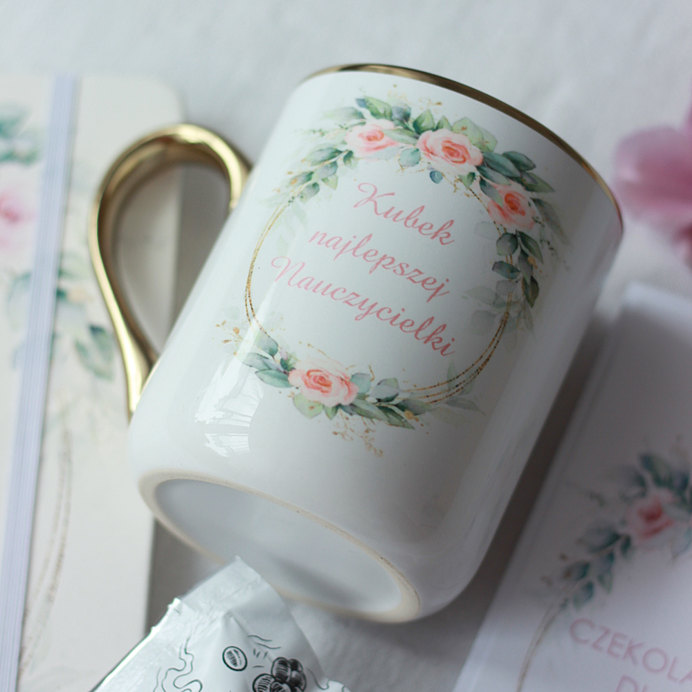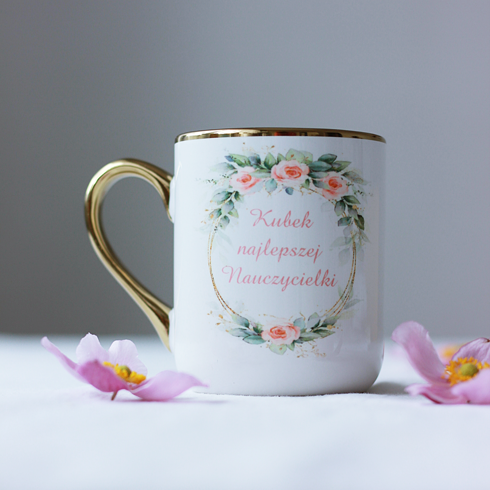 Kubek z nadrukiem/ kubek najlepszej Nauczycielki/ kubek ze złotym rantem i uchem - prezent Dzień Nauczyciela/ Zakończenie Roku Szkolnego