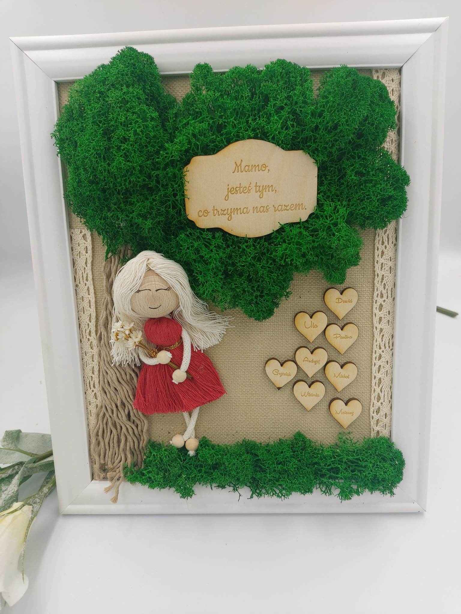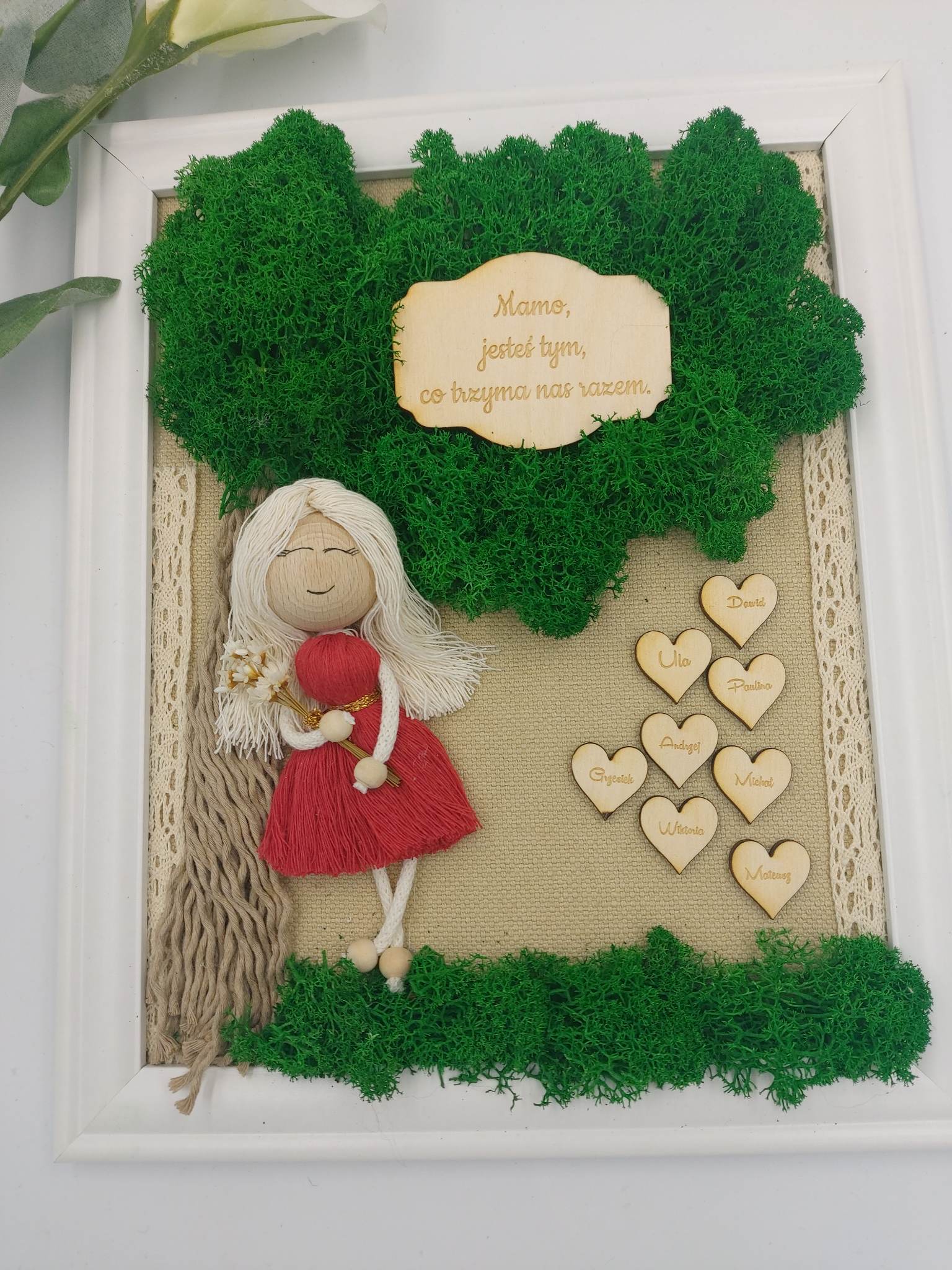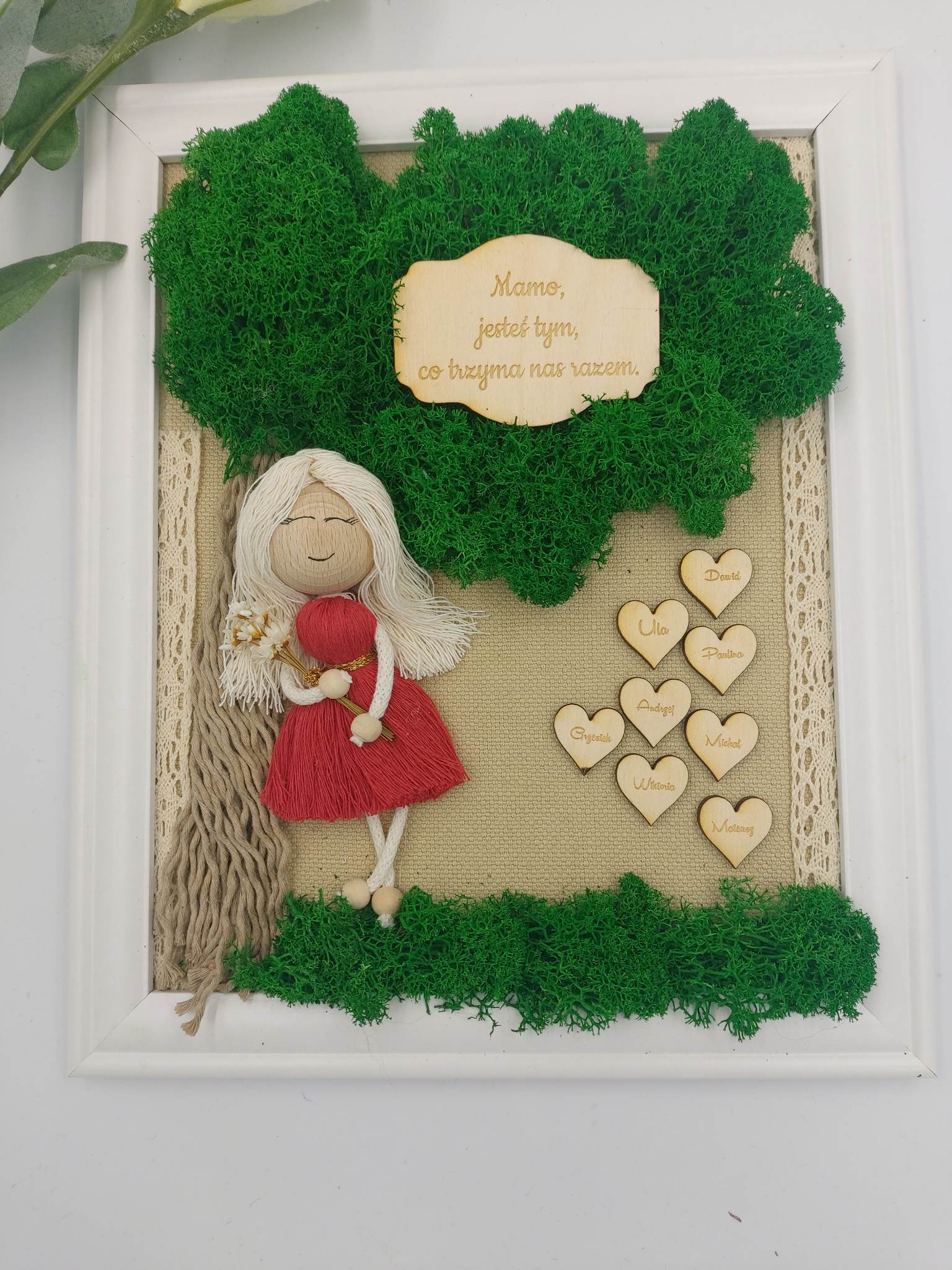 Obraz, ramka drzewo żywy chrobotek , laleczka makrama personalizowana - wyjątkowy prezent dzień mamy/ Matki