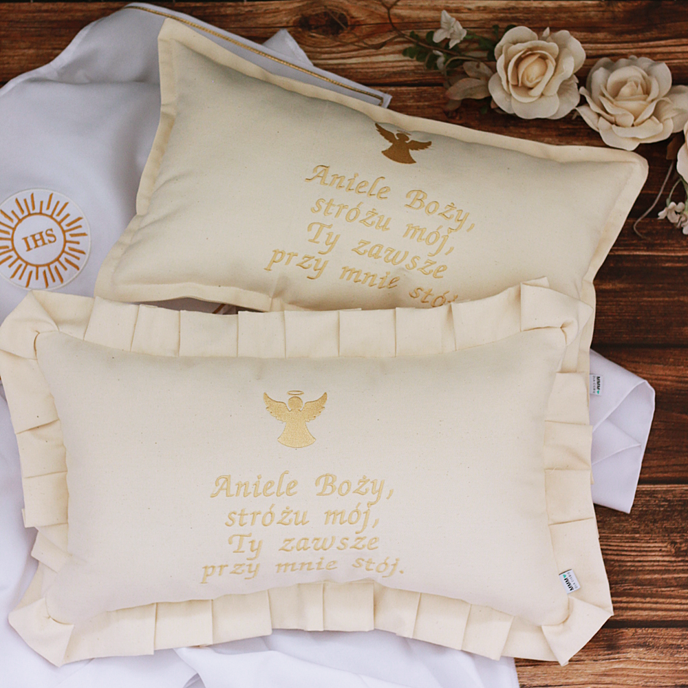 Elegancka poduszka z haftowaną modlitwą „Aniele Boży” to wyjątkowy i symboliczny prezent na I Komunię Świętą lub Chrzest. Naturalna tkanina i delikatne wykonanie sprawiają, że jest to piękna pamiątka na długie lata.