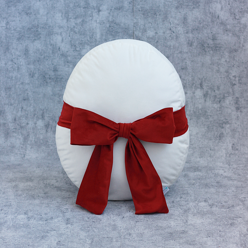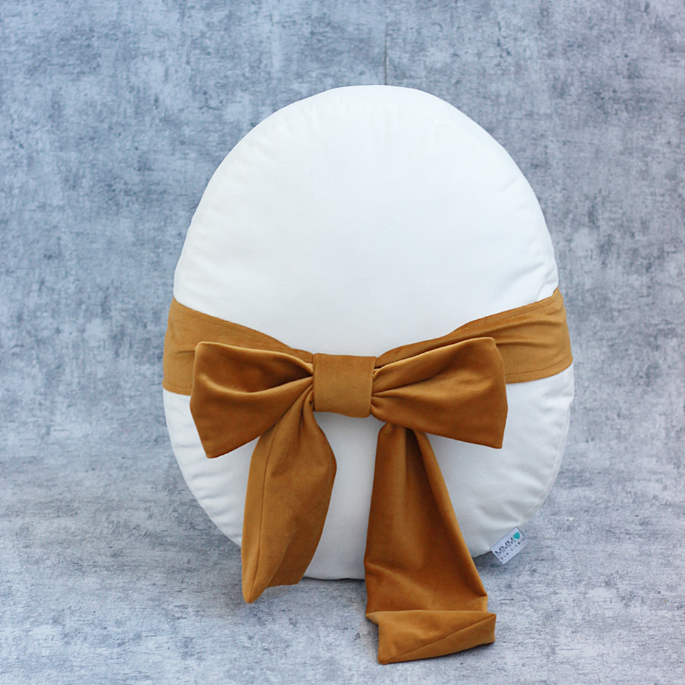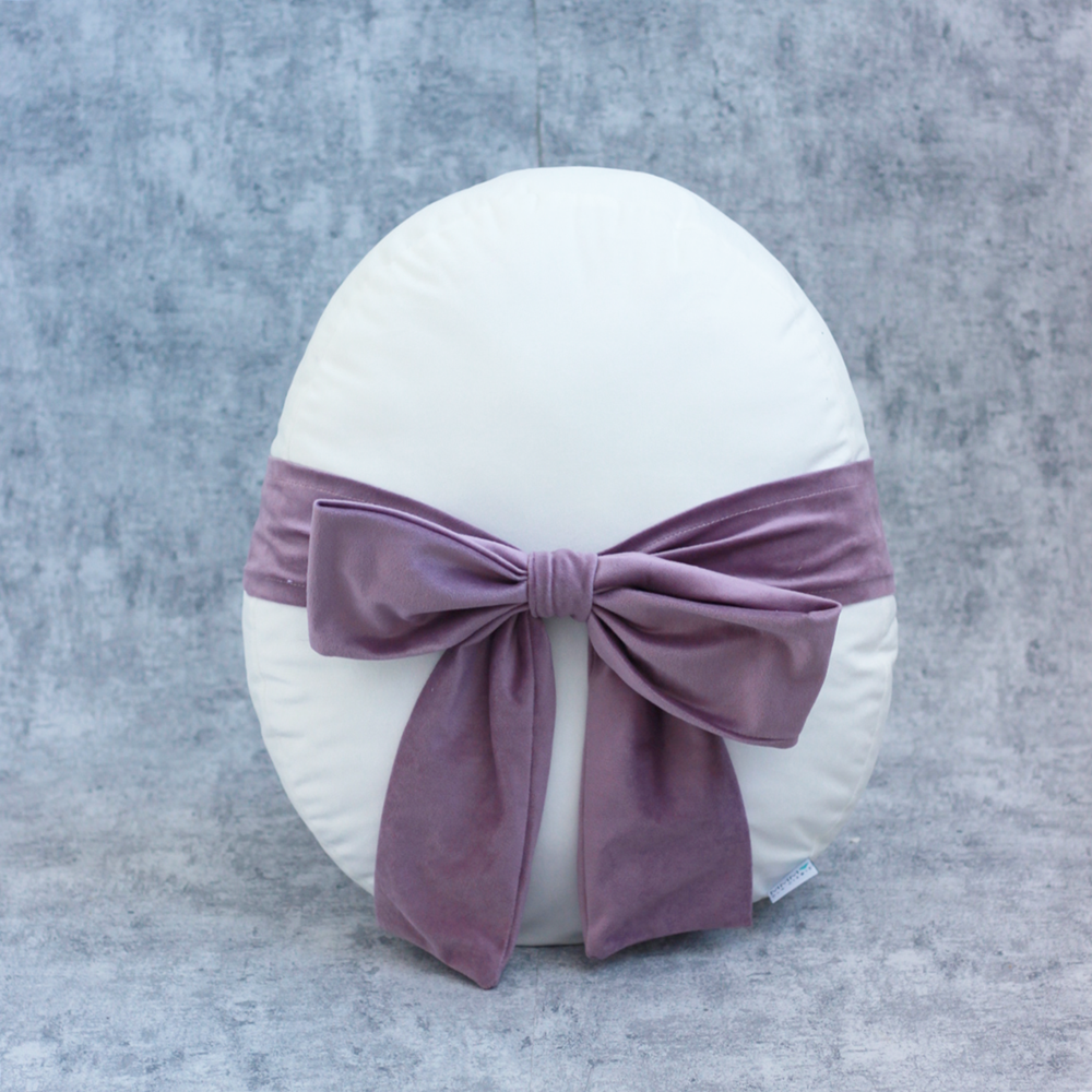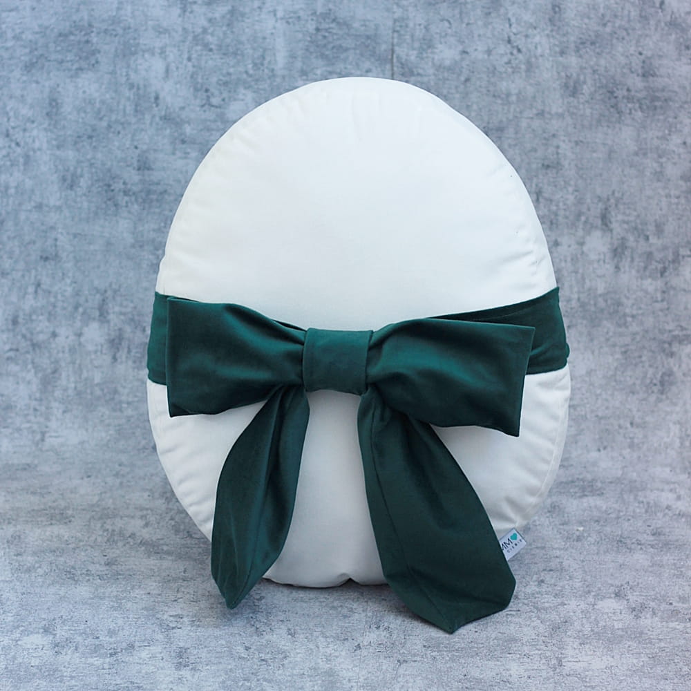 Stylowa poduszka w kształcie jajka, wykonana z mięciutkiego weluru i ozdobiona dużą, elegancką kokardą. To wyjątkowa dekoracja, która wprowadzi świąteczny klimat do każdego wnętrza.