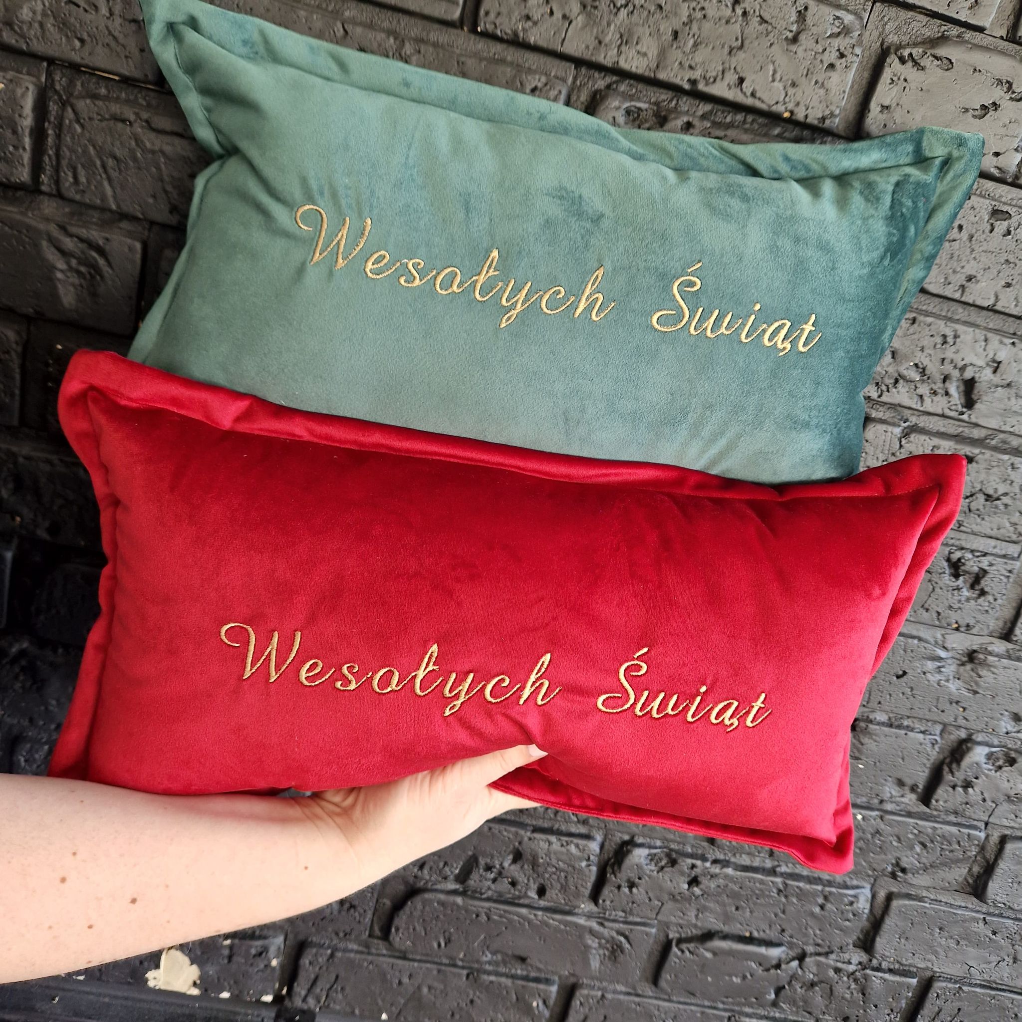 Poduszka, zagłówek z haftem Wesołych Świąt.