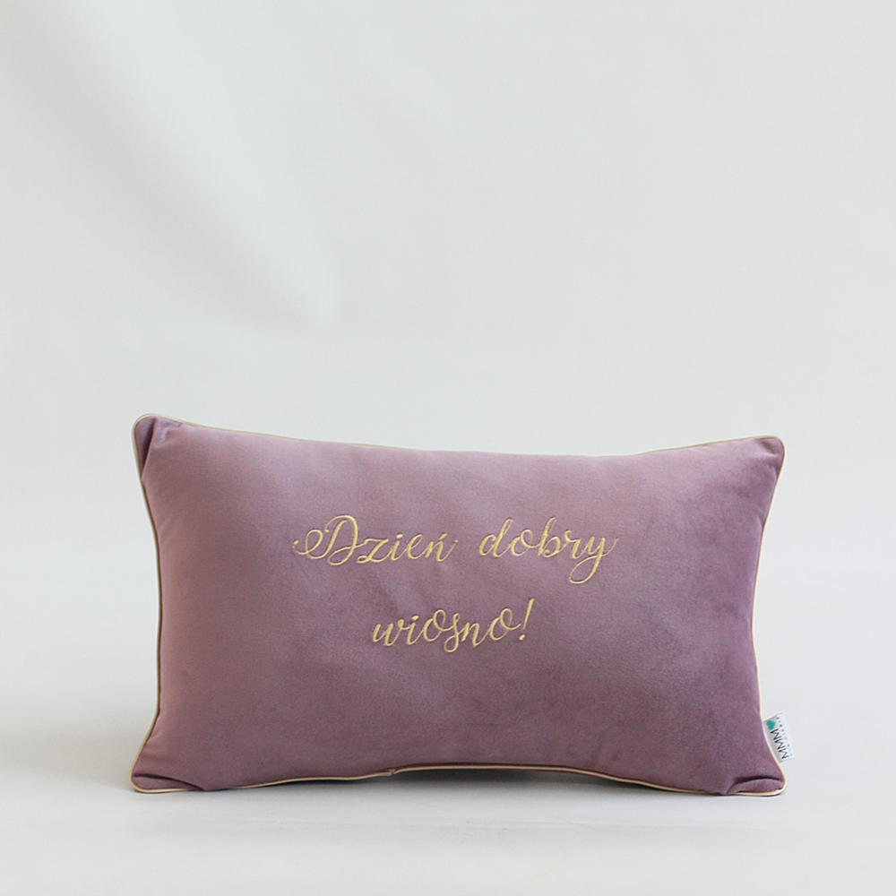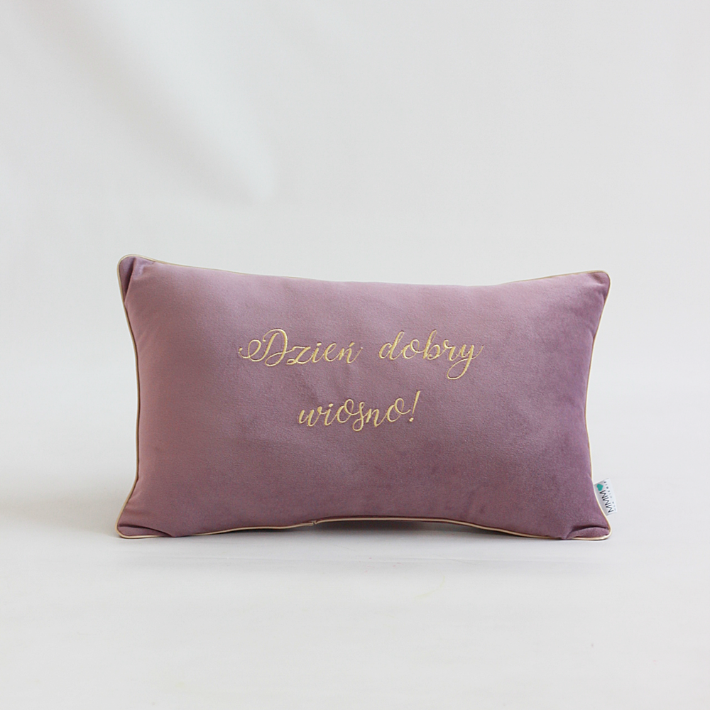 Poduszka wałek z uroczym haftem "Dzień Dobry Wiosno", wykonana z mięciutkiego weluru. Idealna do wiosennego wnętrza – doda świeżości i koloru każdemu pomieszczeniu.