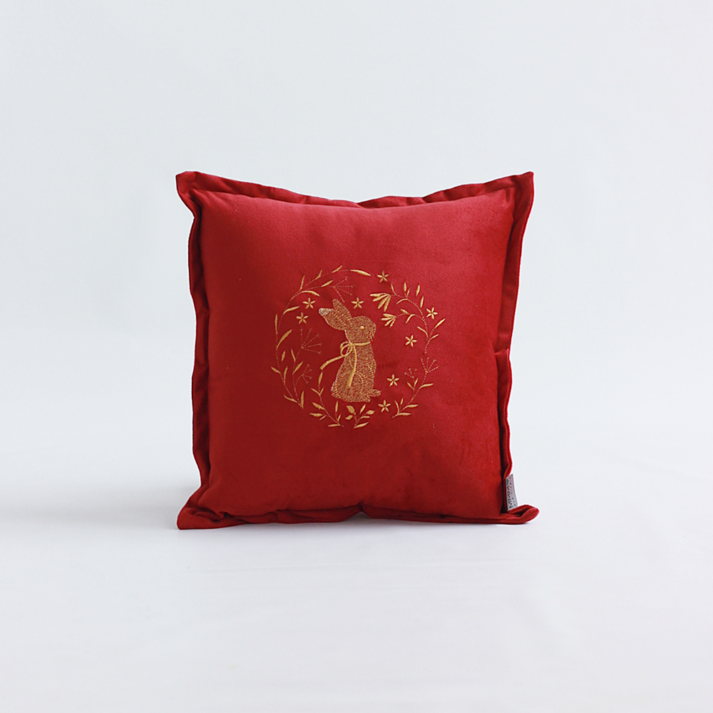 Poduszka z weluru z haftowanym zającem to wyjątkowa dekoracja, która wprowadza do wnętrza przytulny i świąteczny klimat. Doskonale sprawdzi się jako ozdoba kanapy, fotela lub łóżka.