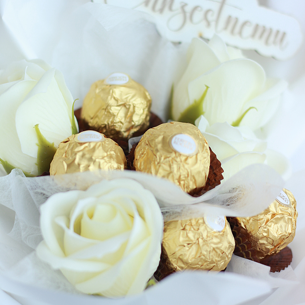 | Elementy | Ferrero Rocher, róże mydlane, biały koszyczek, dekoracje |