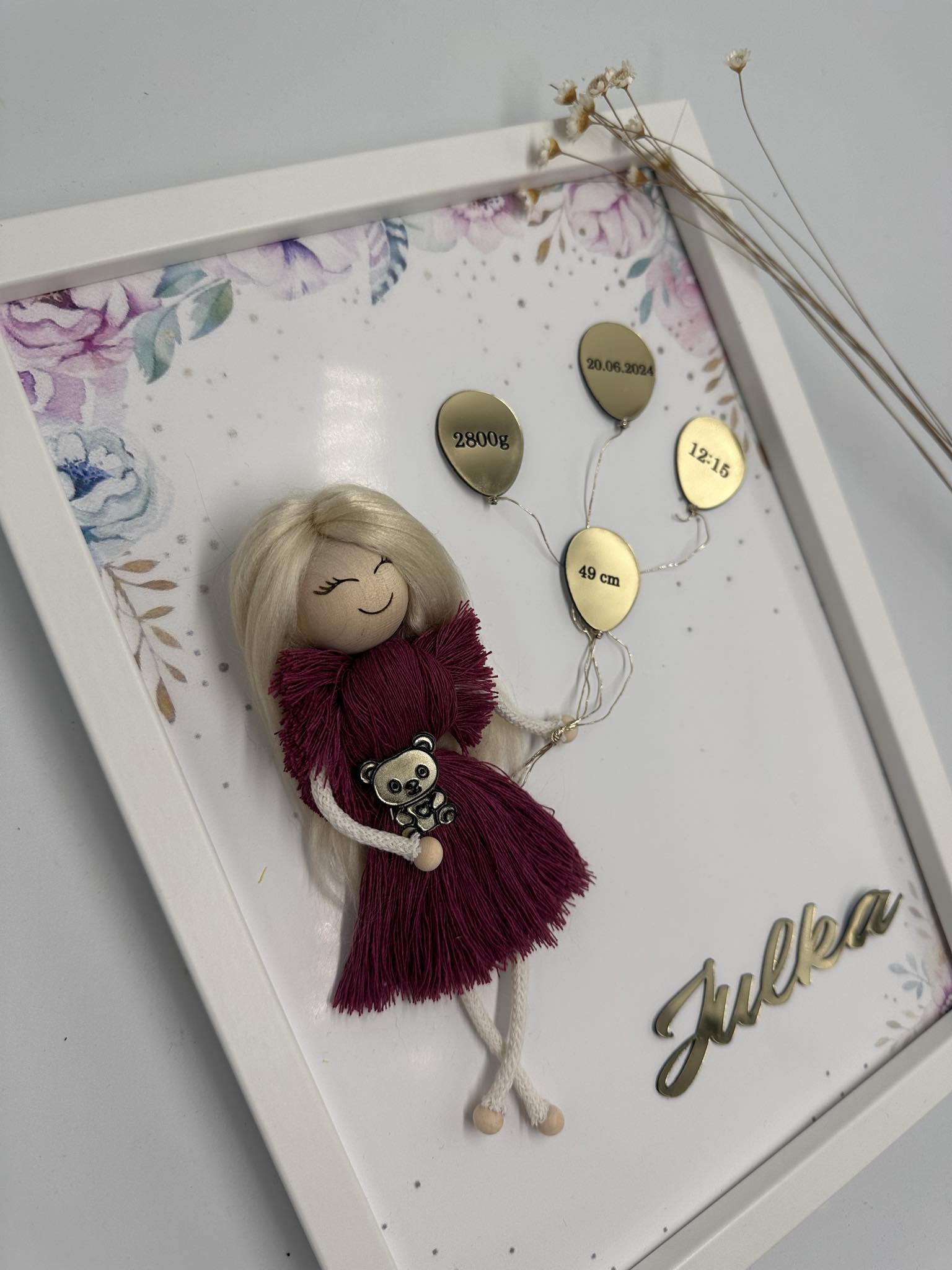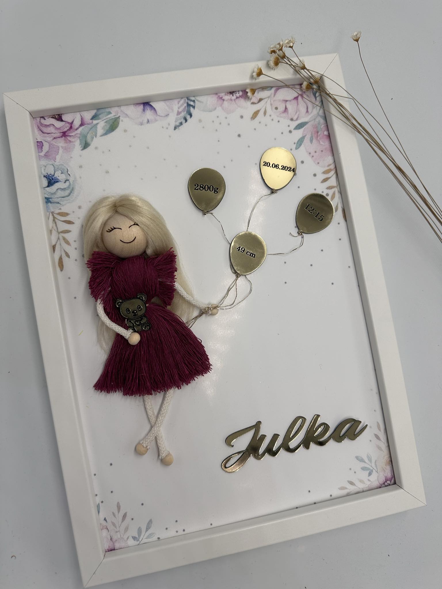Ramka biała/ personalizowana/ lustro/ laleczka makrama - pamiątka, metryczka
